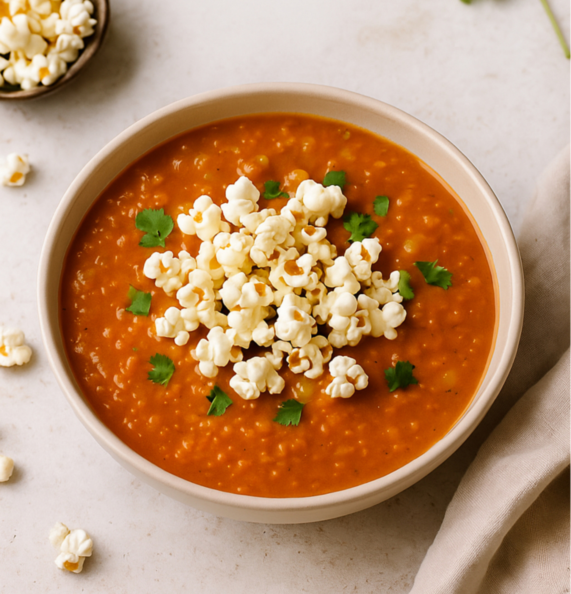 A warming, hearty soup that combines the wholesome goodness of lentils with aromatic spices and vegetables. Finished with a playful garnish of freshly popped popcorn, this modern dish brings together comfort and creativity in every bowl.